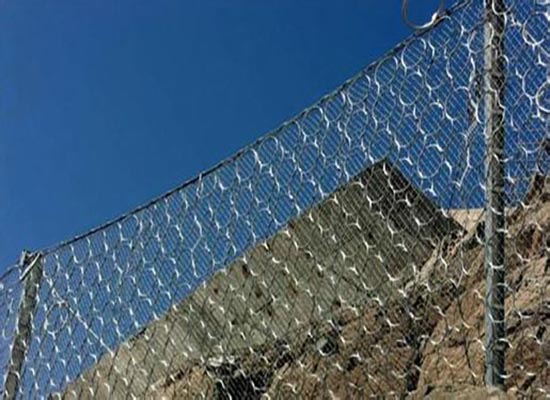 被動防護網采用錨杆、鋼柱、支撐繩和拉錨繩等固定方式將金屬柔性網以一定的角度安裝在坡麵上,形成柵欄形式的欄石網,從而實現對落石和泥石流體中固體物質攔截的一種防護網。由鋼絲繩網或環形網(需攔截小塊落石時附加一層鋼絲格柵)、固定係統(錨杆、拉錨繩、基座和支撐繩)、減壓環和鋼柱四個主要部分構成,前者為起特征構成。起防護能量一般為150KJ~2000KJ,特殊設防能高達5000KJ。被動係統根據起防護能量、結構形式和特征構成的不同分為三類17種型號。